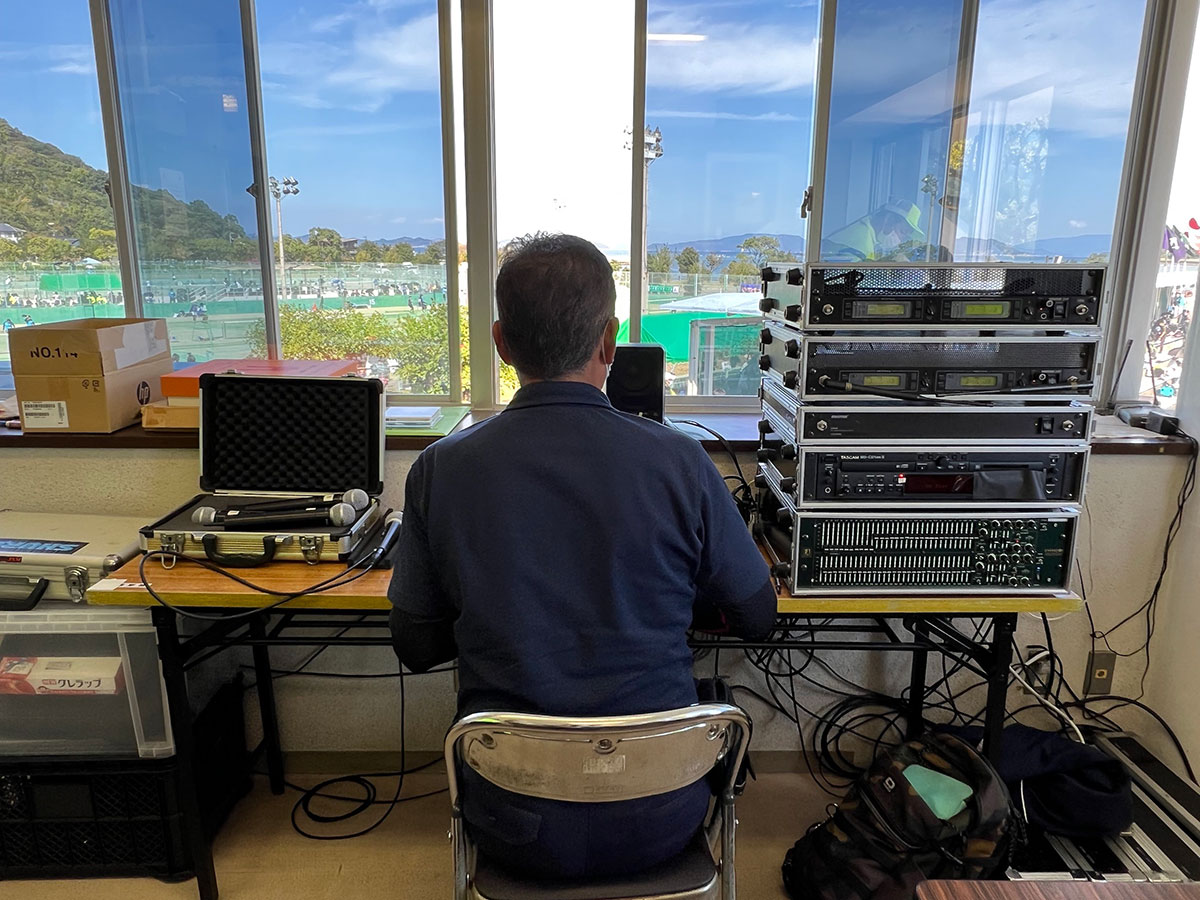 会期中、大会の主催者は出場選手の呼び出しや観覧者に対して必要な情報を適宜放送するのですが、その放送設備や放送時に適切に情報が届くよう音量などの調節をするのが音響の仕事です。